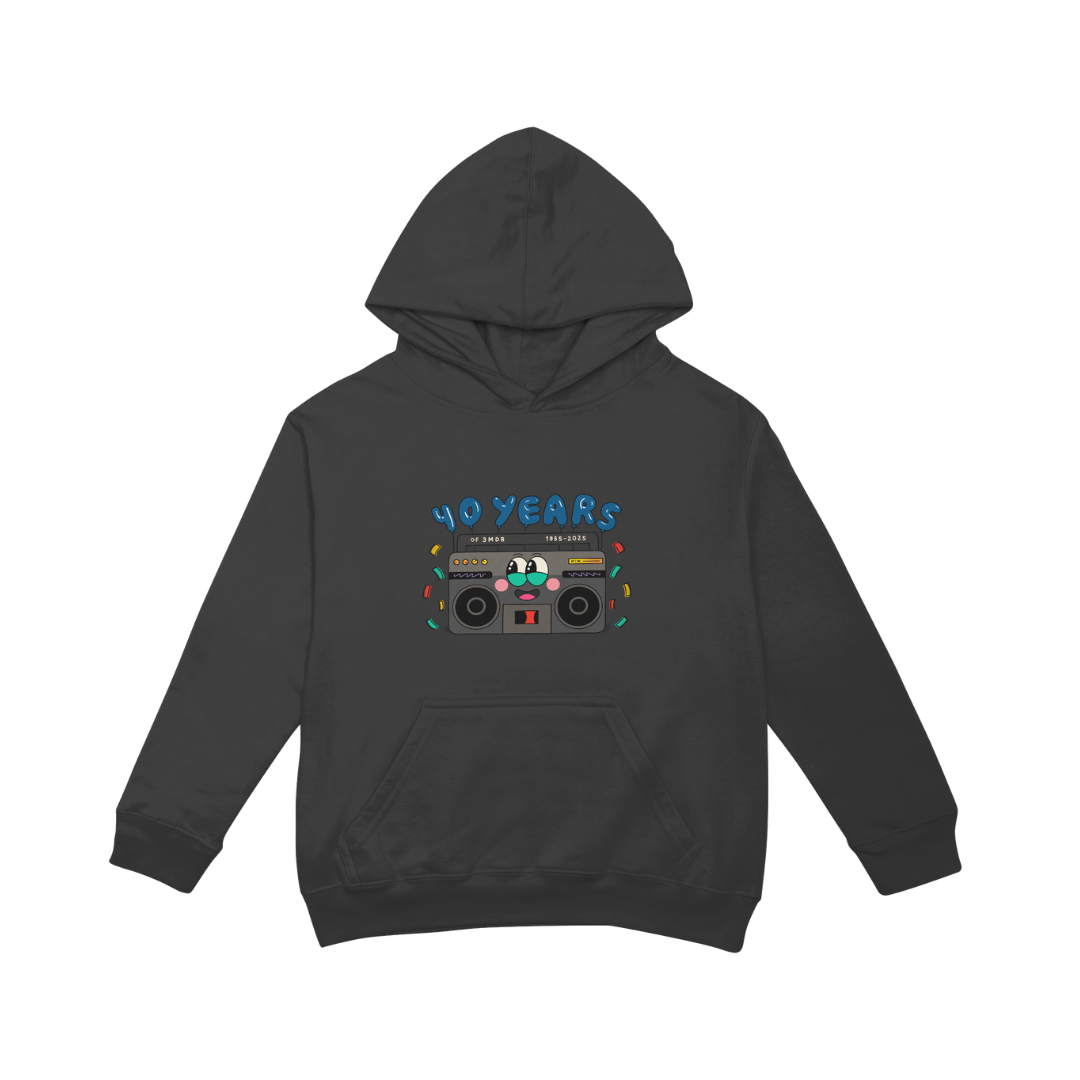 Celebrate 40 years of Mountain District Radio with this black faded hoodie! Artwork by Eddie Andrews.